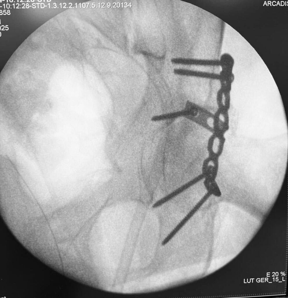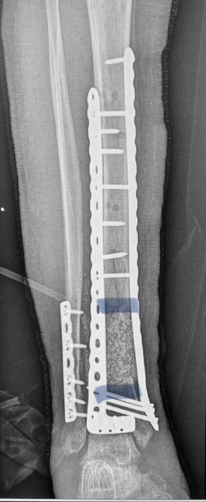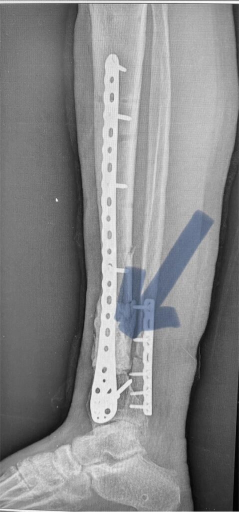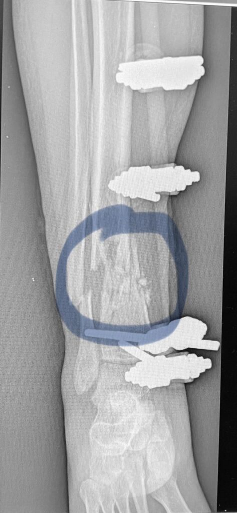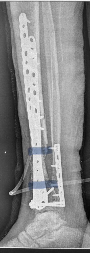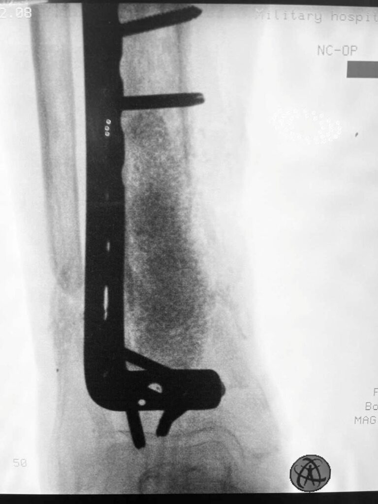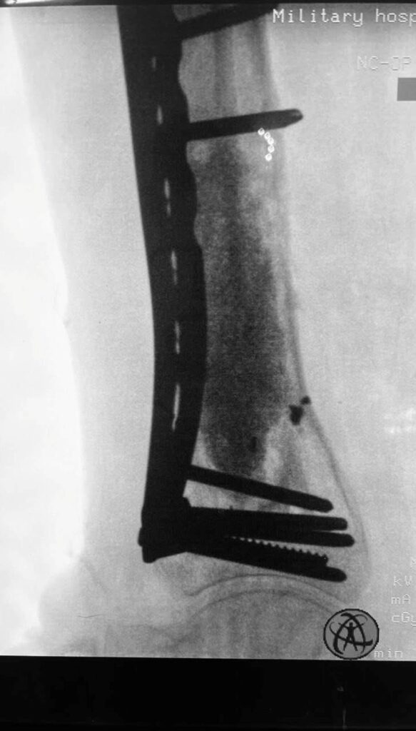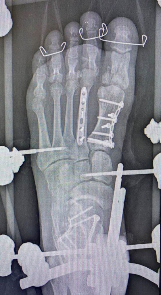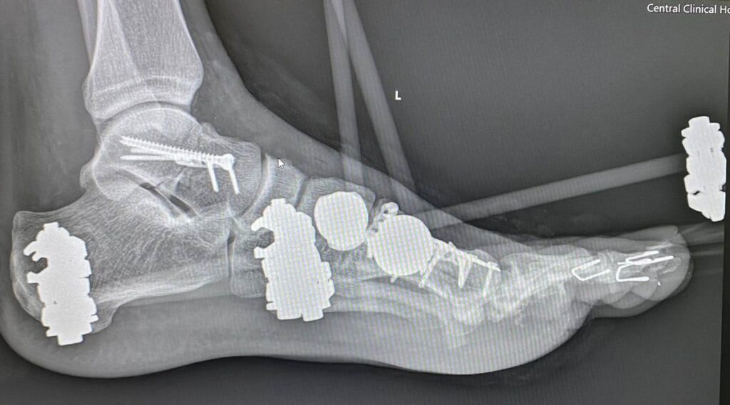Дальше – всё сделано. «Копытце» вот такое. И рентген. С винтами через развернутую пятку в большеберцовую кость.