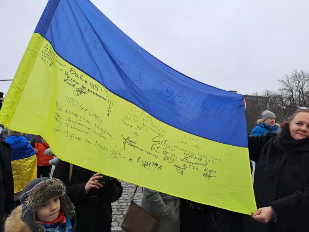 Кстати, привет «с родной земли» прибыл. Пока меня не было, к Петру Витальевичу ребята заходили. Навестить своих раненых побратимов. Флаг передали вот этот. С «Приветом из Курщины». Так написано. И с подписями парней.