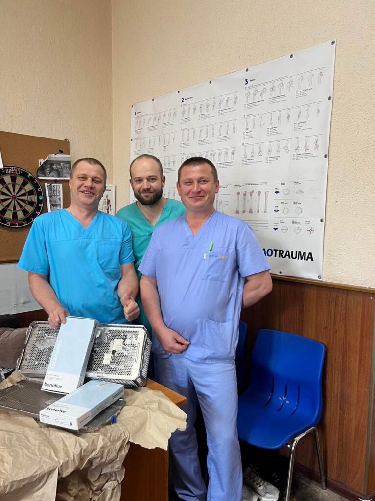 Вот на первом фото председатель AO Trauma Ukraine Олександр Рихтер передает инструмент и BONALIVE (заменитель кости) доктору Степану Барабашу для госпиталя во Львове.