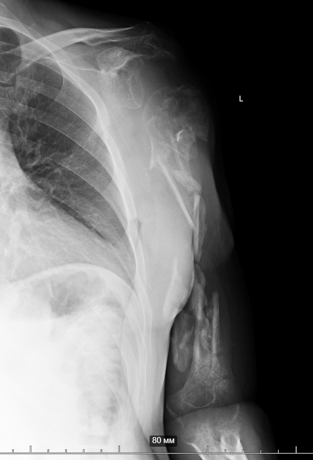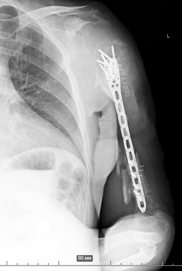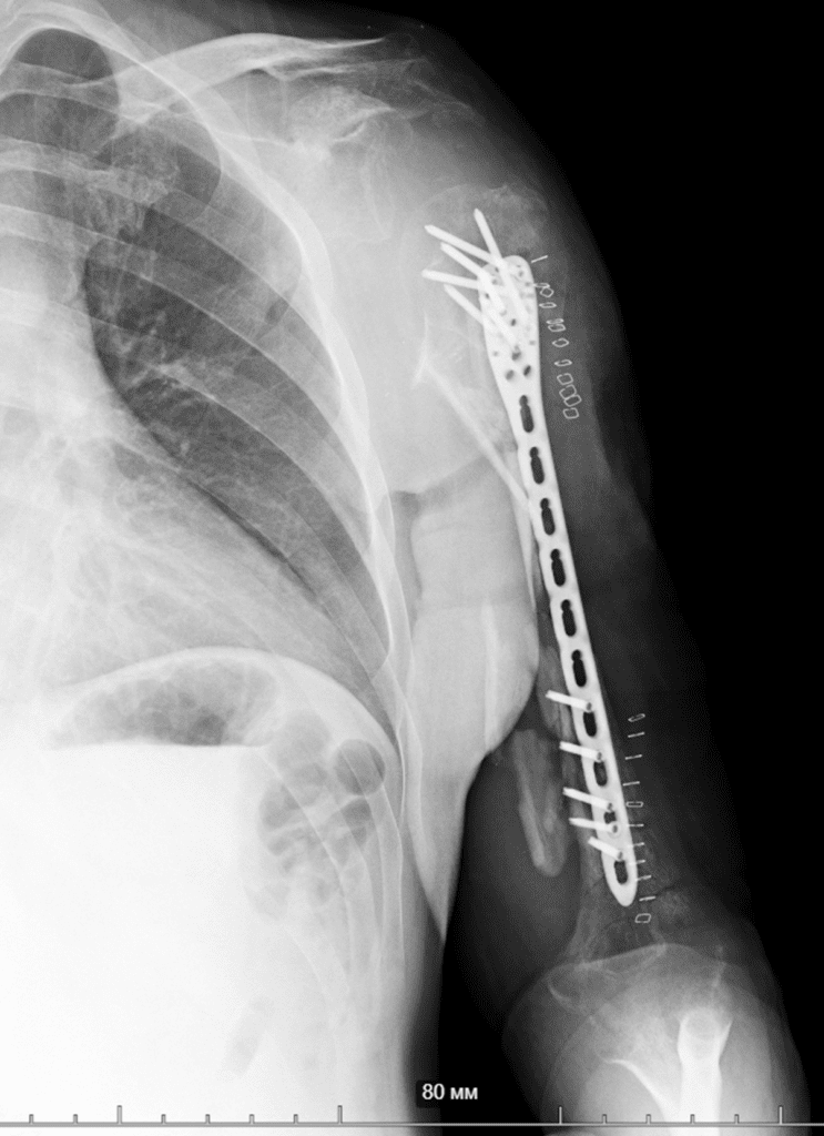 So, together with Vasyl Parii and Denys Dolgush, instead of performing massive bone grafting immediately, we decided to stabilize the severely damaged humerus (see X-rays) with a plate using a minimally invasive approach — and took new tissue samples for culture. In peacetime and in case of a normal civilian injury (usually the main bacteria in such cases is Staphylococcus Aureus), we would do bone grafting simultaneously with internal fixation. But the presence of the “Iraqi bacteria” in early investigations does not allow this; the risk of severe complications is too high.